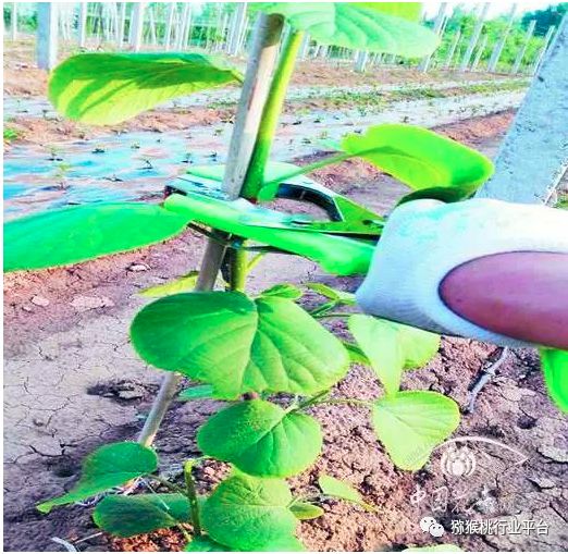 栽植水泥柱后可以用细绳或竹竿牵引幼苗上长,未栽植水泥柱的及时插竹竿牵引,力争幼苗主干端直上长,每隔20厘米至25厘米将幼苗固定绑缚牵引绳或竹竿。可以用绑枝机绑扶,省工省力。