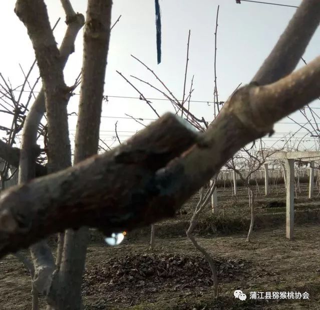 此时,这些养分和水会(透明的水滴)通过果树的伤口流出,这些伤口主要有冬剪未愈合的伤口、绑枝拉伤的伤口,溃疡病锯口等,形成我们所见的伤流。