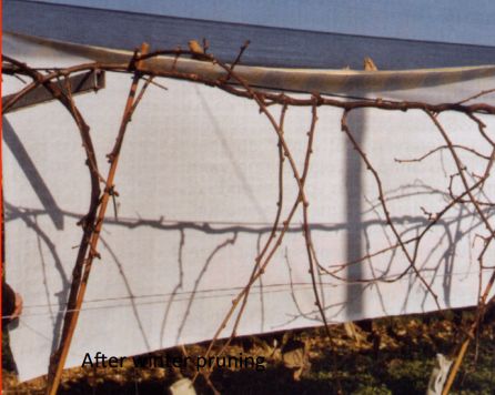冬季修剪:将主蔓上长势过旺的背上枝,及种植行内侧的枝条全部进行修剪,仅保留结果母枝上间距为20cm的中庸枝,作为下一年的结果母枝。
