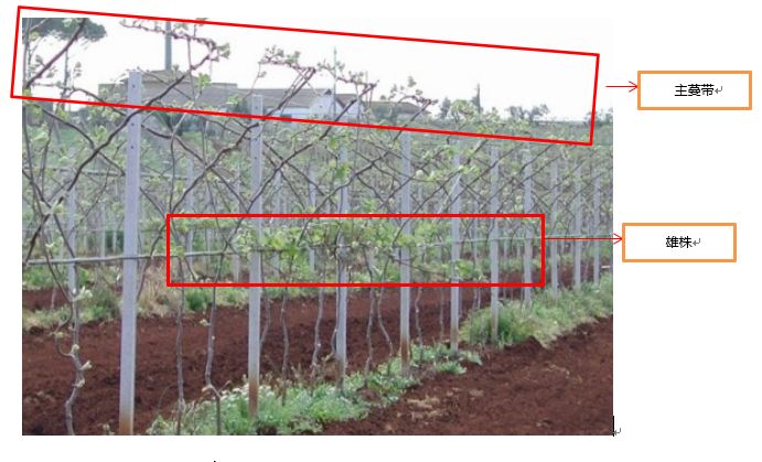 雄株种植在种植行中,高度为1米,不占用架面的面积,且因为花粉很轻,会向上漂浮,雄花位于雌花下面,授粉效果比较好,但不利于蜜蜂授粉。